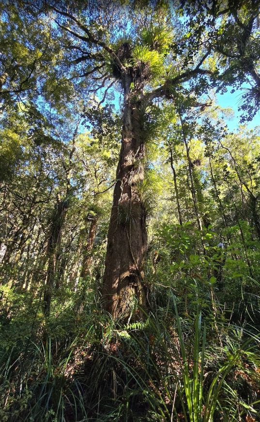 Der Kahikatea (Dacrycarpus dacrydioides) kann eine beeindruckende Höhe von bis zu 60 Metern erreichen und gehört damit zu den höchsten Bäumen der südlichen Hemisphäre. Diese Nadelbaum-Art ist besonders in Feuchtgebieten und Sümpfen zu finden, wo die Bäume oft dichte Bestände bilden. Ihre weißen, beerenartigen Früchte sind eine wichtige Nahrungsquelle für einheimische Vögel.